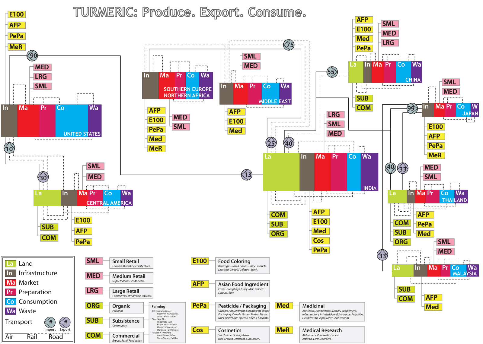 Diagram Exercise showing the world wide distribution of Turmeric from where it originates from and how much is shipped where and its end use.